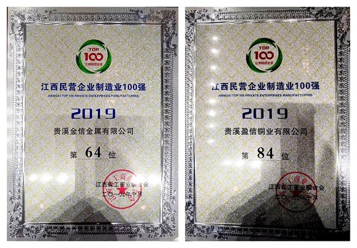 10月30日, 2019赣商创新发展论坛暨江西民营企业100强发布会上,江西省政府授予环球体育(中国)集团旗下贵溪金信金属有限公司和贵溪盈信铜业有限公司“2019江西民营企业制造业100强”称号。