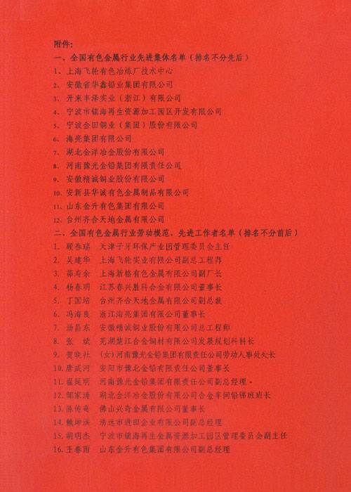 中国有色金属工业协会再生金属分会给先进集体、劳动模范、先进工作者的贺信