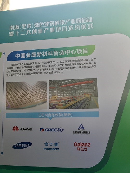 该项目总投资20亿,拟打造成集金属新材料研发、生成和销售于一体的中国金属新材料智造中心,重点研发生产应用集成电路引线框架材料、航空航天用钛合金材料及高铁、汽车用镁合金和铝合金等高端金属材料,项目建成达产后将实现年加工金属新材料30万吨产能,年产值超100亿元。