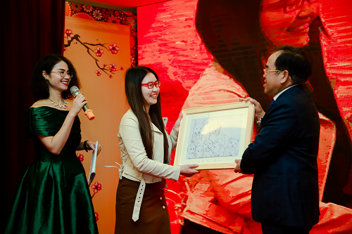 为了感恩董事长对女员工们的厚爱,女员工代表回赠了董事长一幅《环球体育(中国)大家庭》画作。
