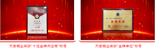除了精彩纷呈的主题分享及风云对话外,本次采购节还进行了“金采奖”颁奖典礼暨2021供应链年度风云榜颁奖仪式,天奇铜业凭借着行业领先的综合实力、高标准的产品质量、全面贴心的优质服务和过硬的供应链实力一举荣获“十佳金牌供应商”和“金牌单位”称号,这也是对天奇铜业品牌及口碑力量的充分认可与印证。