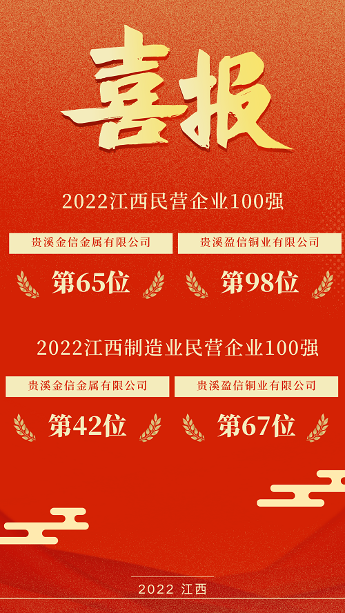 环球体育(中国)集团循环绿色制造板块旗下贵溪金信金属有限公司、贵溪盈信铜业有限公司以优秀的成绩连续四年上榜江西民营企业100强、江西制造业民营企业100强,充分展现了环球体育(中国)集团的综合实力和竞争力,体现了环球体育(中国)在复杂多变的市场环境下,仍处于高质量发展阶段。
