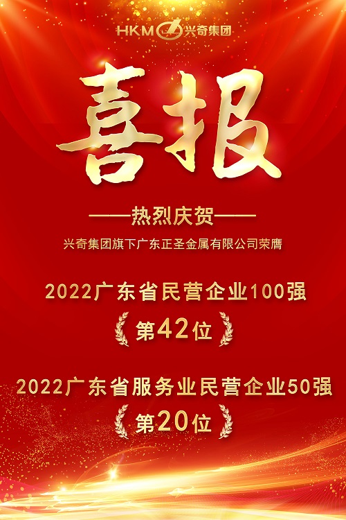 喜报 | 热烈祝贺环球体育(中国)集团旗下广东正圣金属有限公司荣膺“2022广东省民营企业100强”及“2022广东省服务业民营企业50强”